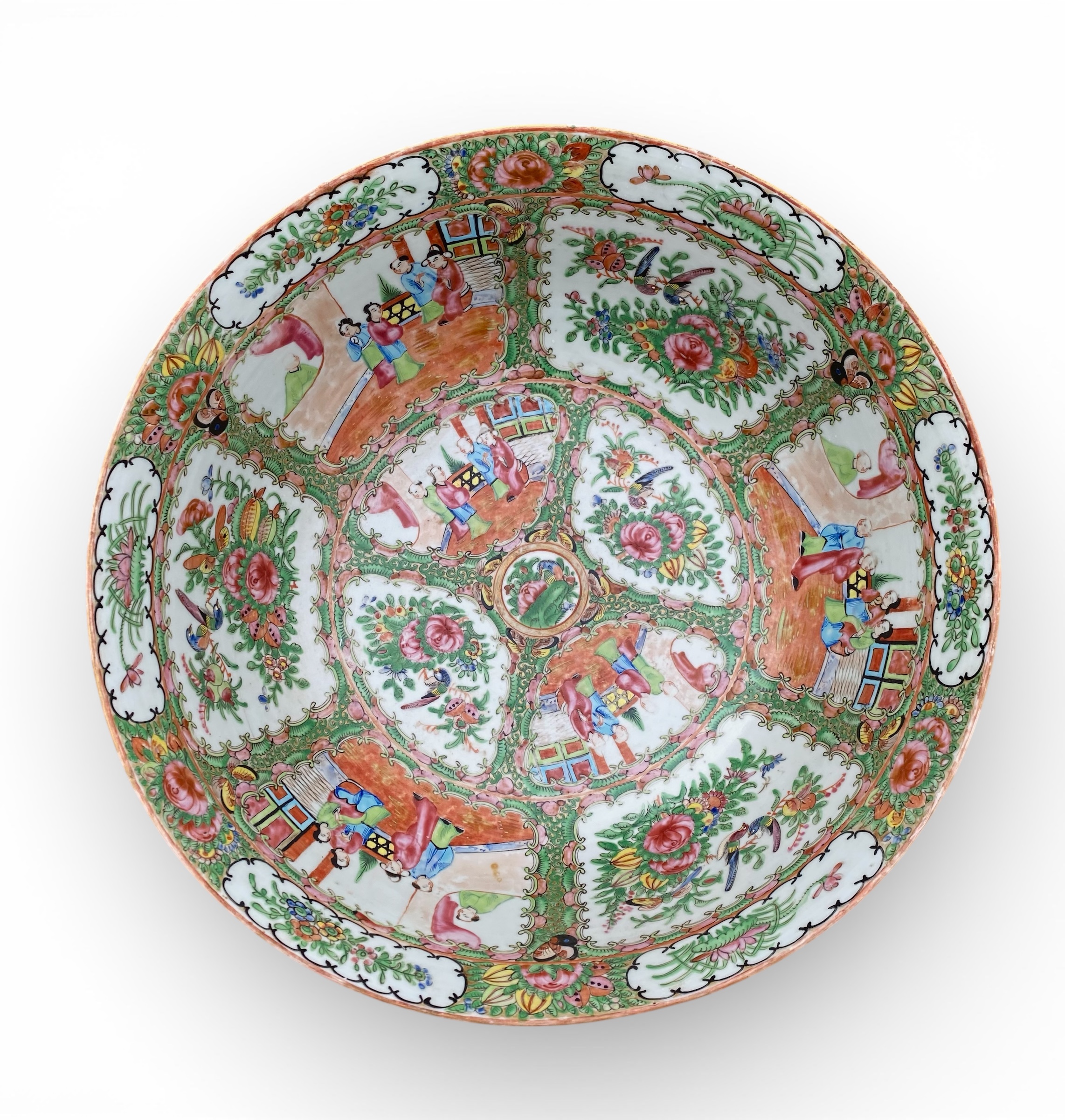 A large Cantonese porcelain punch bowl, China, c. 1900. Well decorated to the interior, in typical Cantonese style, with famille rose enamels of panels of figures before pavilions, alternating with panels of birds amongst flowering plants.