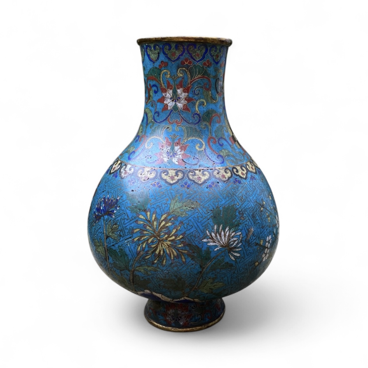 Chinese cloisonné Hu shaped vase, 18th Century. The large pear shaped vase decorated in Ming style, with a continuous scene of flowering plants, including lotus in a river, against Greek key fret, on a turquoise ground.