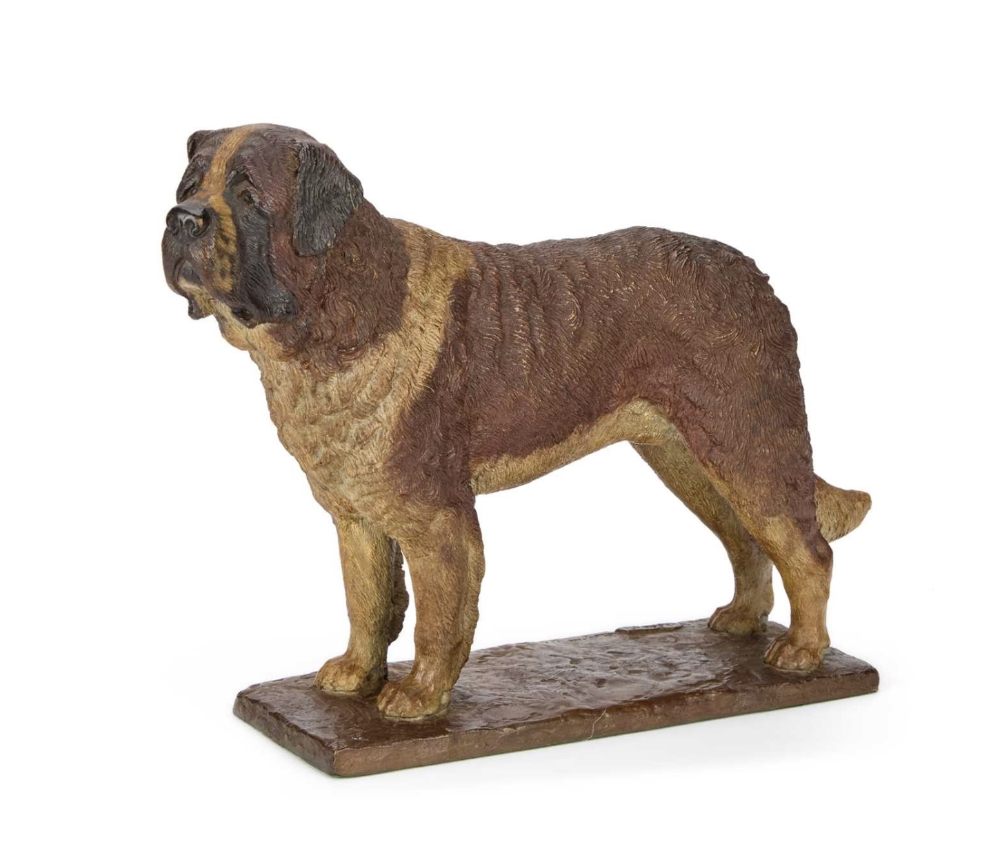 ELIZABETH WAUGH (1929-2023) bronze study of a St Bernard. The solid bronze dog, modelled, standing upon a rectangular base. Finely cast,with a typically doleful expression on his face, and enhanced with cold painted enamel detail.