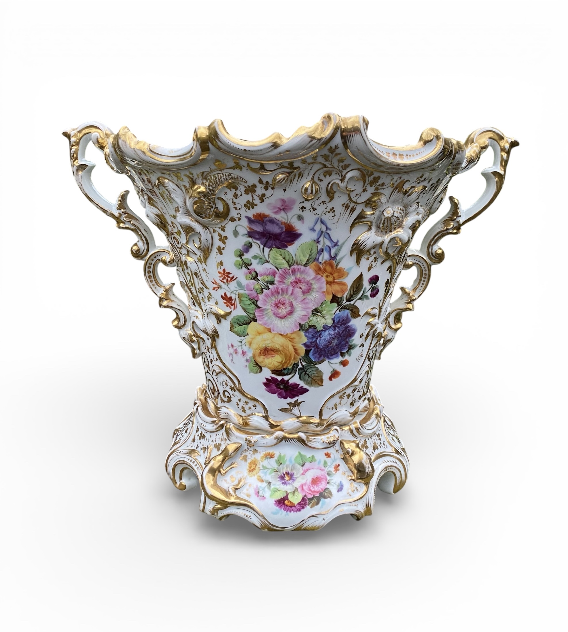 A large French porcelain cache pot and stand, c. 1850. The huge pot, with elaborate rococo scroll moulding and twin handles, beautifully hand painted to the front, with a large spray of flowers. The reverse, painted with a scene of lovers, seated before a a fountain.