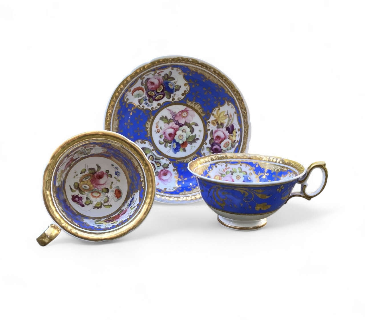 H & R. Daniel porcelain trio, c. 1830. Comprising of a saucer, tea cup and coffee cup. The saucer finely hand painted with a central panel of Spring flowers, surrounded by three shaped panels containing further sprays of flowers, on a blue ground, heightened with gilt decoration. All within a gilt gadroon border.