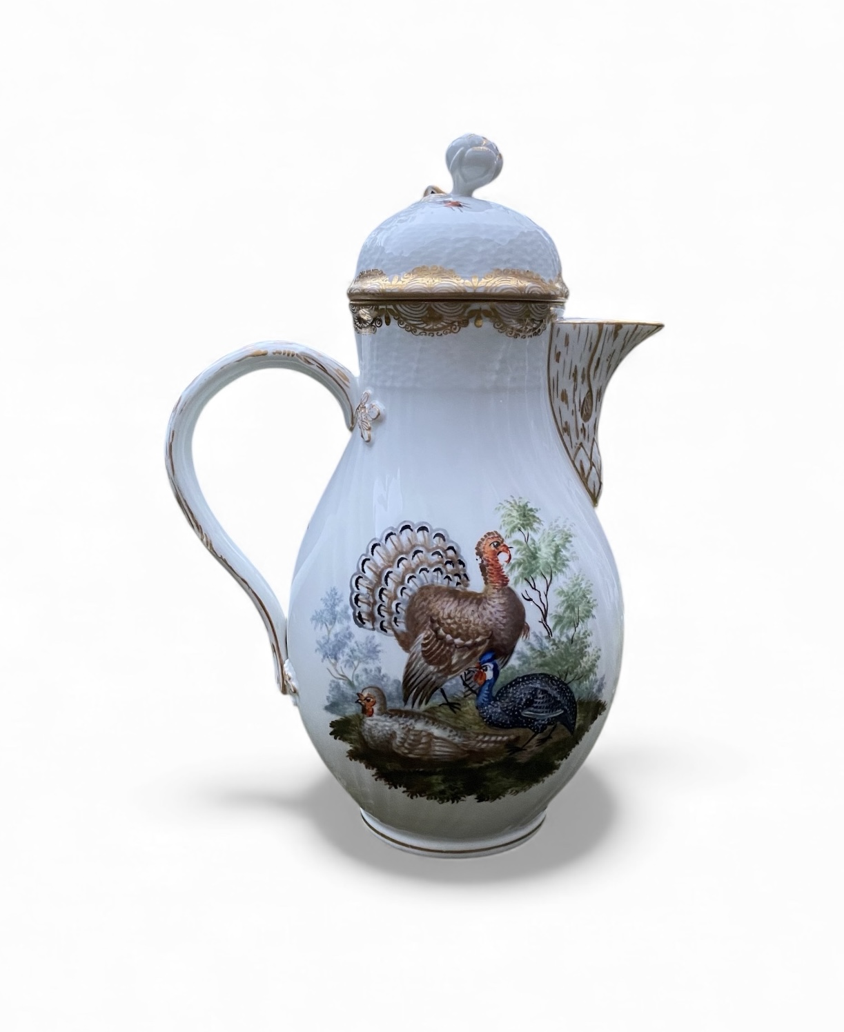 KPM Berlin porcelain coffee pot, c. 1880. The wrythen moulded coffee pot, finely hand painted with a cockerel and hens to one side, and turkeys to the reverse, along with moths and insects. Having a branch handle, with leaf terminals, heightened in gilt.