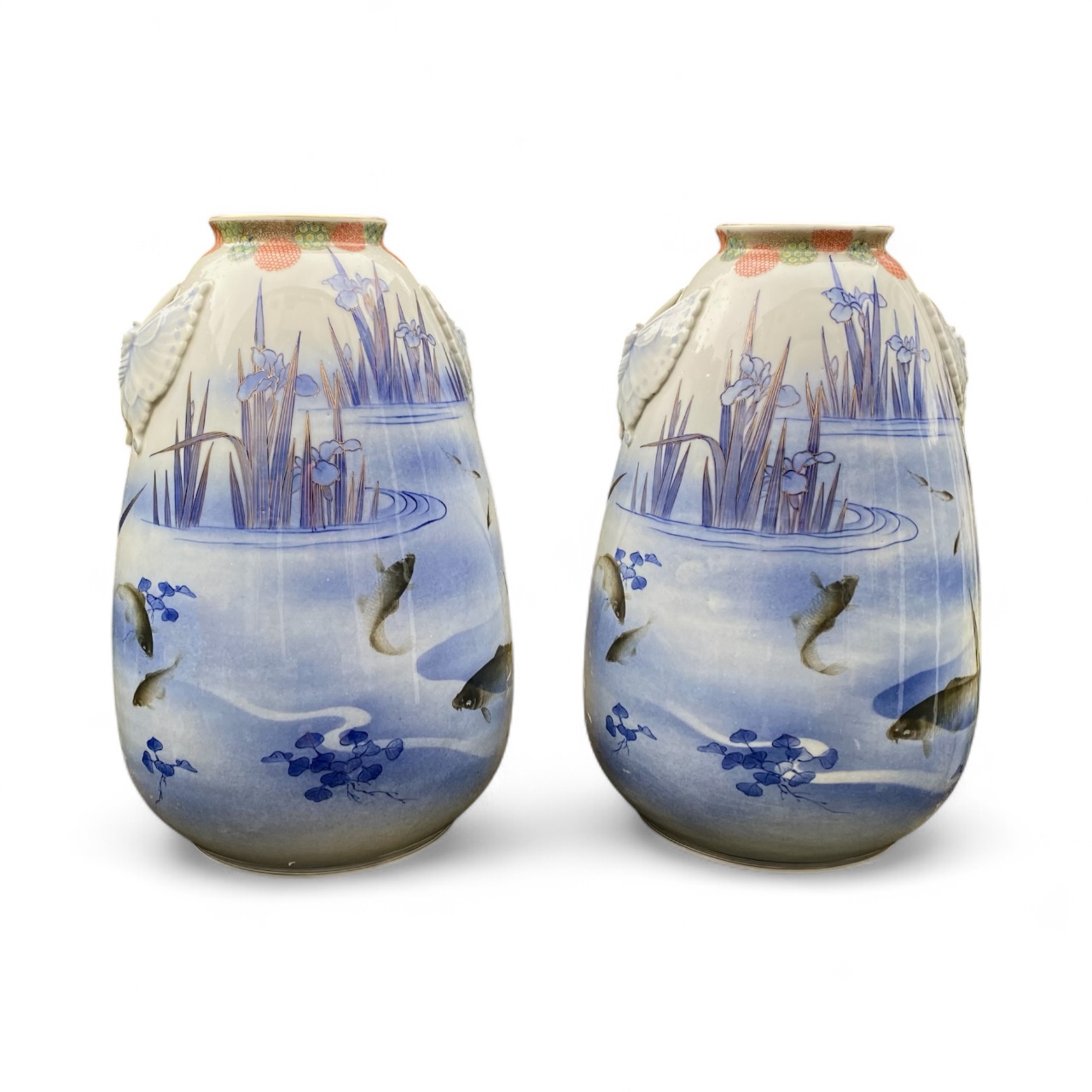 Pair of large Fukugawa porcelain vases, c. 1925, Taisho Period. Both pear shaped vases, decorated with carp swimming in rivers. The reverses of which are painted with irises growing along the riverbank, heightened in gilt. Enamelled with brocade roundels to the neck, above large butterfly handles.