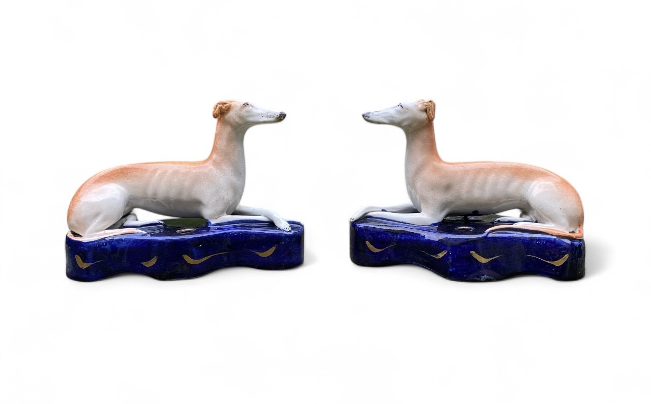 Pair of Staffordshire pottery Greyhound quill holders, c. 1850. The finely modelled Greyhounds, recumbent upon shaped bases, coloured in underglaze cobalt blue, edged in gilt. Each base with apertures to hold quills.