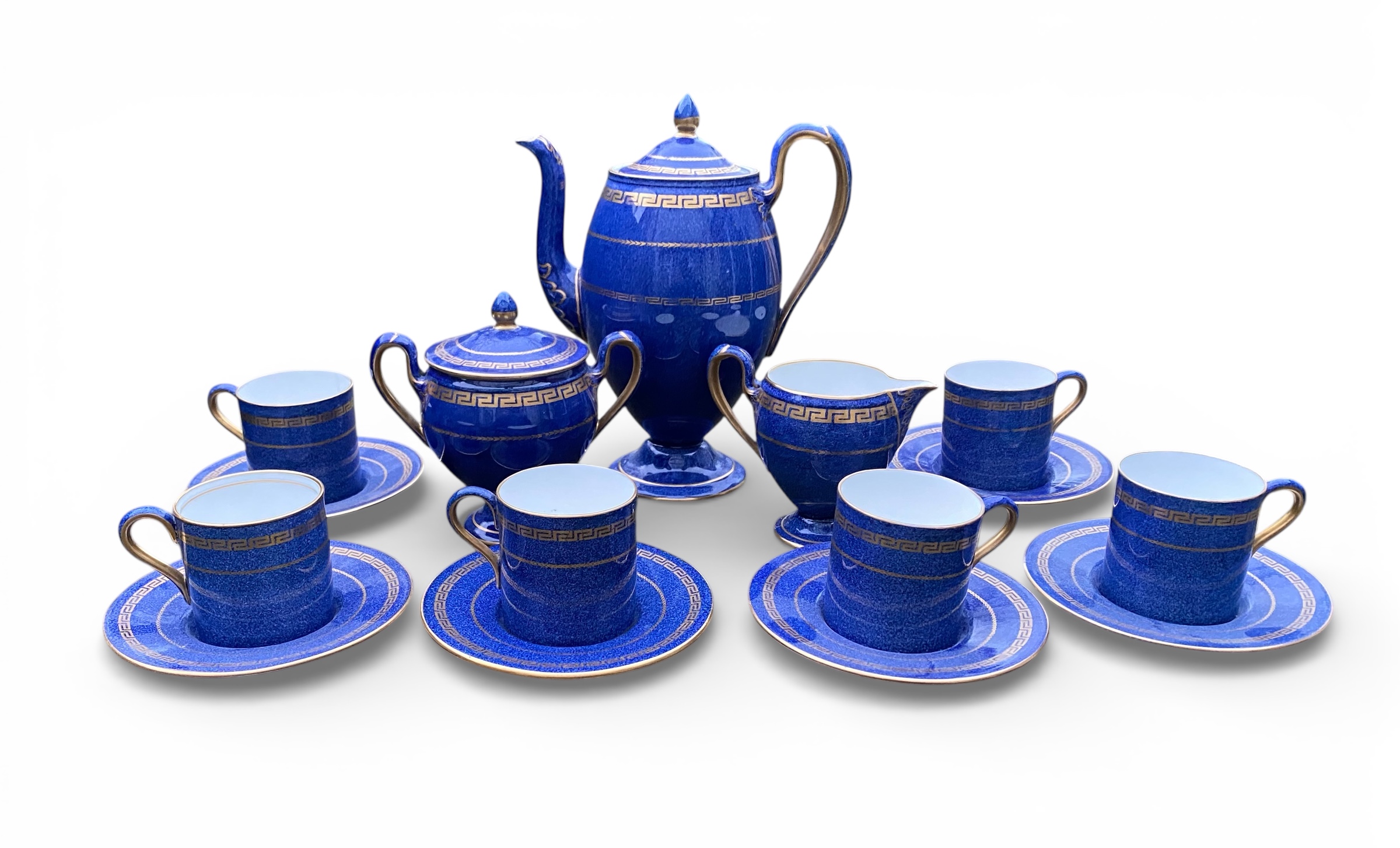 Wedgwood porcelain coffee set, c. 1925. Comprising of a coffee pot, milk jug, sucrier, and six coffee cans and saucers. All pieces decorated with a gilt Greek key fret motif, on a powder blue ground. The coffee pot having a twin branch handle.
