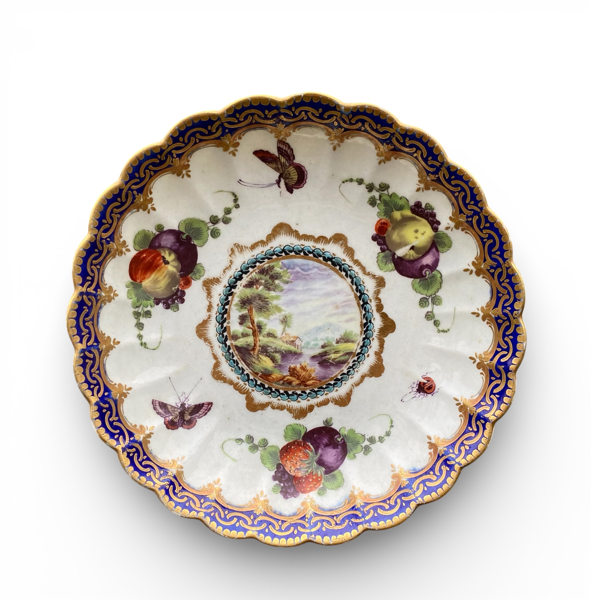 Worcester porcelain saucer, Earl of Dalhousie pattern, c. 1780. The fluted saucer, beautifully hand painted, with a central roundel containing a river landscape. The well finely painted with fruit and insects, within a gilded underglaze, cobalt blue border.