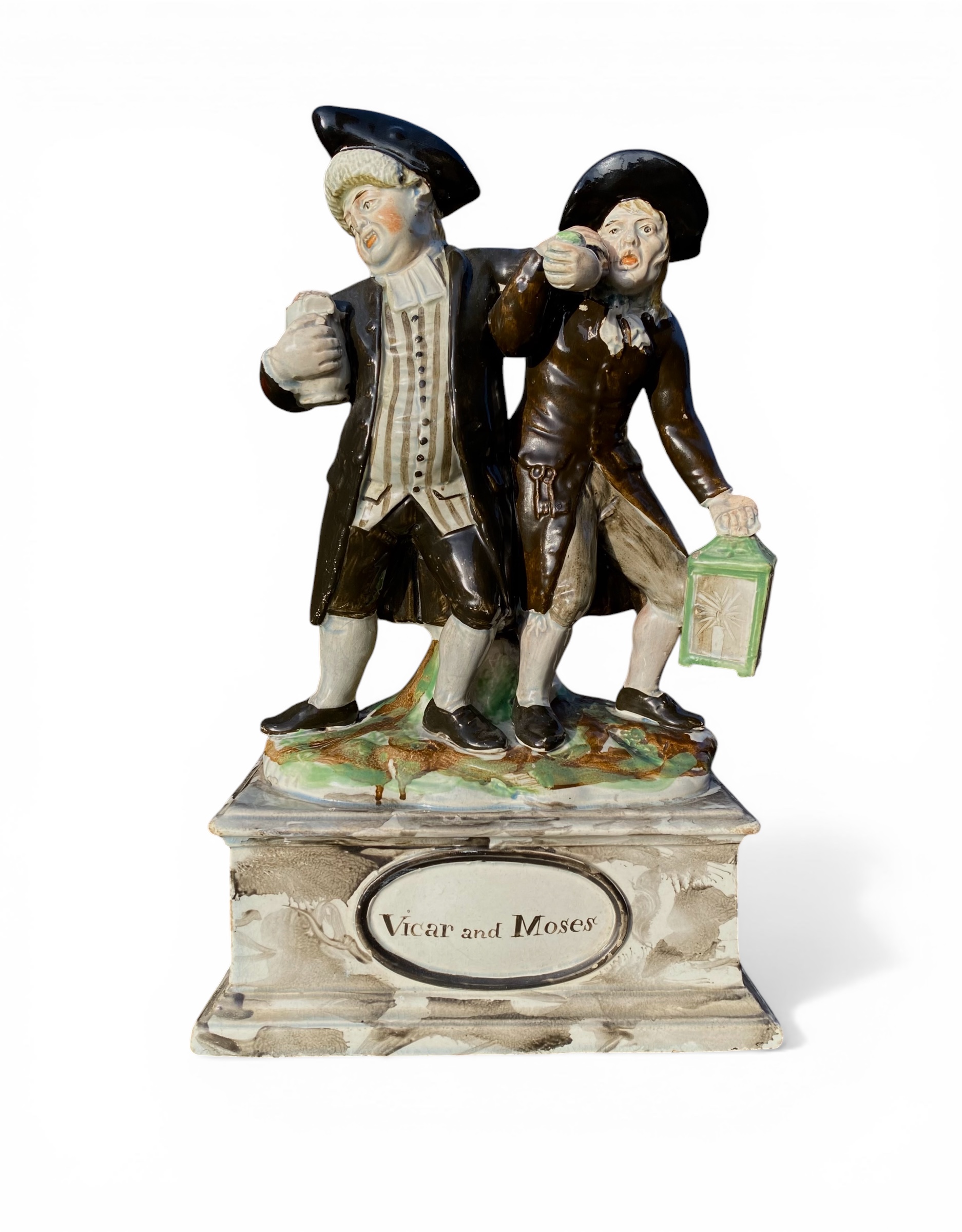Ralph Wood pearlware pottery group, Vicar and Moses, Staffordshire, c. 1785. An exceptionally fine depiction of Moses, escorting the Vicar. Moses carries a large lantern, painted with a lit candle. Wearing 18th Century dress, the heavily inebriated figures stagger back to the church, with the intention of performing a funeral service; standing on an oval grassy mound, which is set upon a large pedestal base, painted to simulate marble. Set with a large oval medallion, inscribed ‘Vicar and Moses’. Decorated in coloured enamels, beneath a pearlware glaze. Height - 30 cm, 11 3/4”. Width - 18.5 cm, 7 1/4”. Depth - 10.7 cm, 4 1/4”. Condition - Slight crack to the chin of Moses. Professional repair to the brim of his hat. Otherwise in excellent condition. A fine, early example of this group, in sharp contrast to the numerous later reproductions, of what was to prove a popular figure, but also illustrate the decline in quality of production at the Staffordshire factories by the end of the 19th Century.