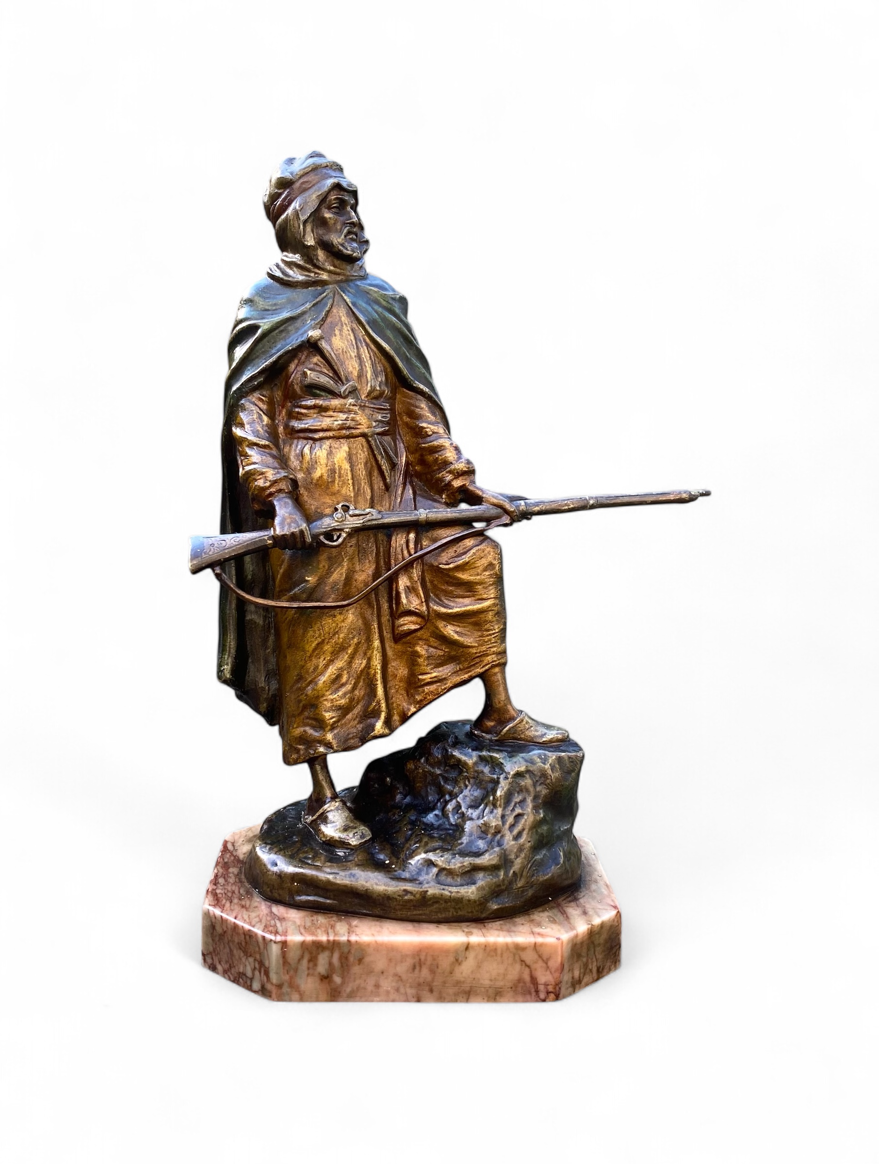Argentor cold painted bronze study of an Arab warrior, Vienna, Austria, c. 1890. The finely rendered figure, modelled as a proud Arab man standing on rocks, and wearing traditional robes. He scans the scene before him, whilst holding a rifle, whilst he carries two daggers in the sash around his waist.