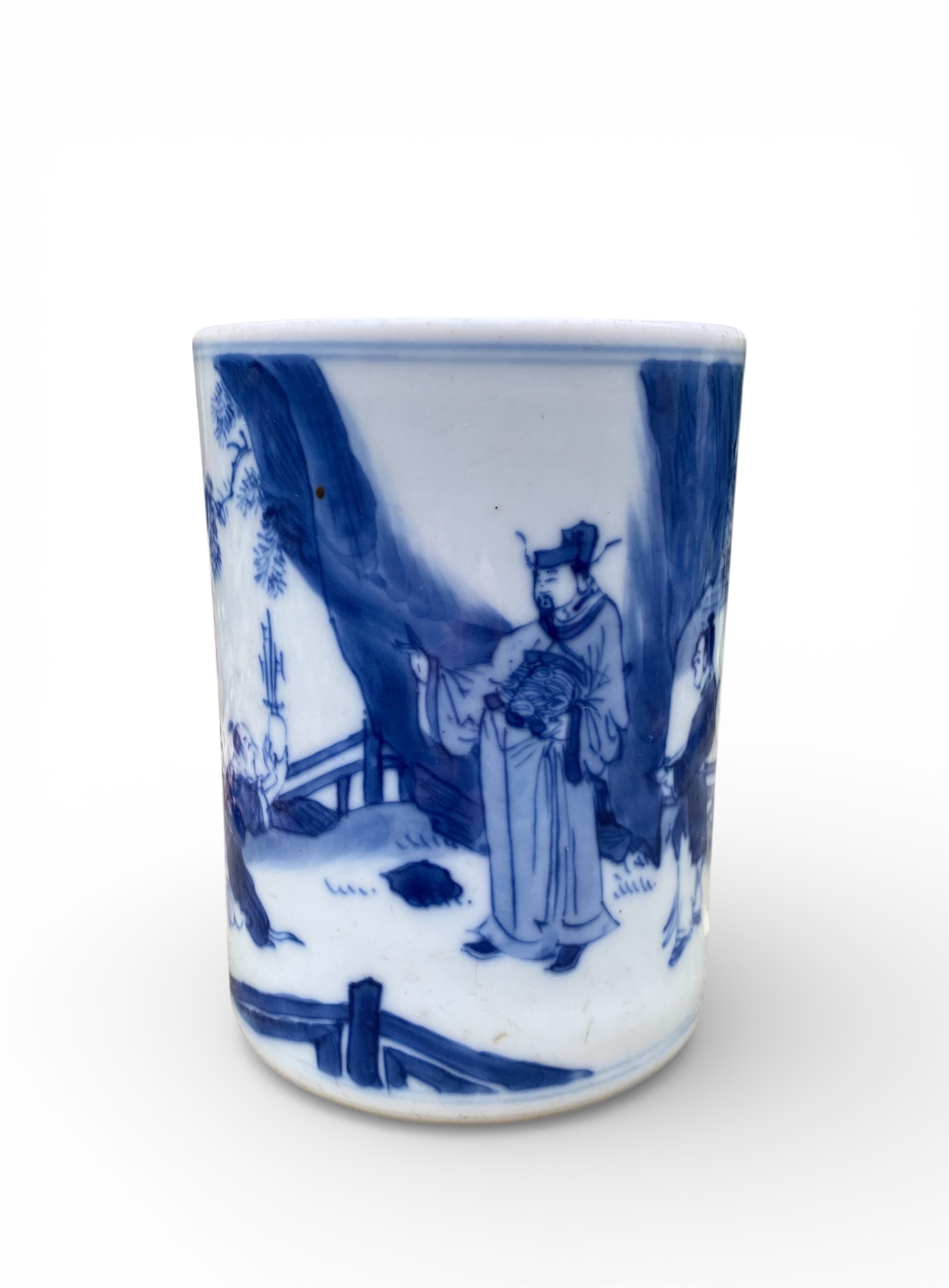 Chinese porcelain bitong, c. 1700, Kangxi Period. The brush pot, hand painted in underglaze blue, with attendants making offers to a Dignitary, standing in a garden, before a large rock.