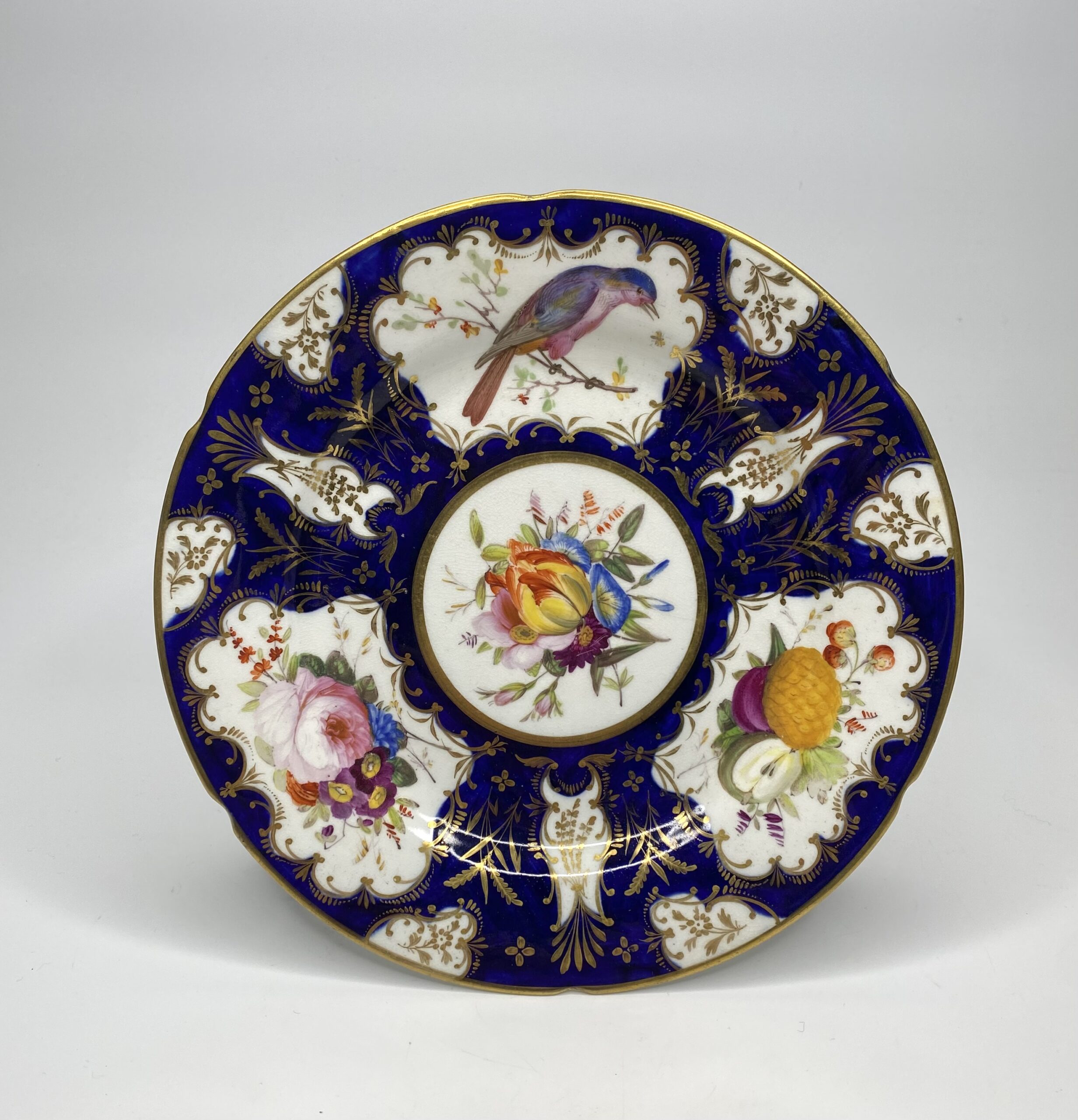 Coalport porcelain plate, c. 1830. Well painted to the centre, with a spray of flowers, within a circular gilt panel. The border with three shaped gilt scroll panels, contains a bird perched upon a branch, a spray of flowers, and fruit.