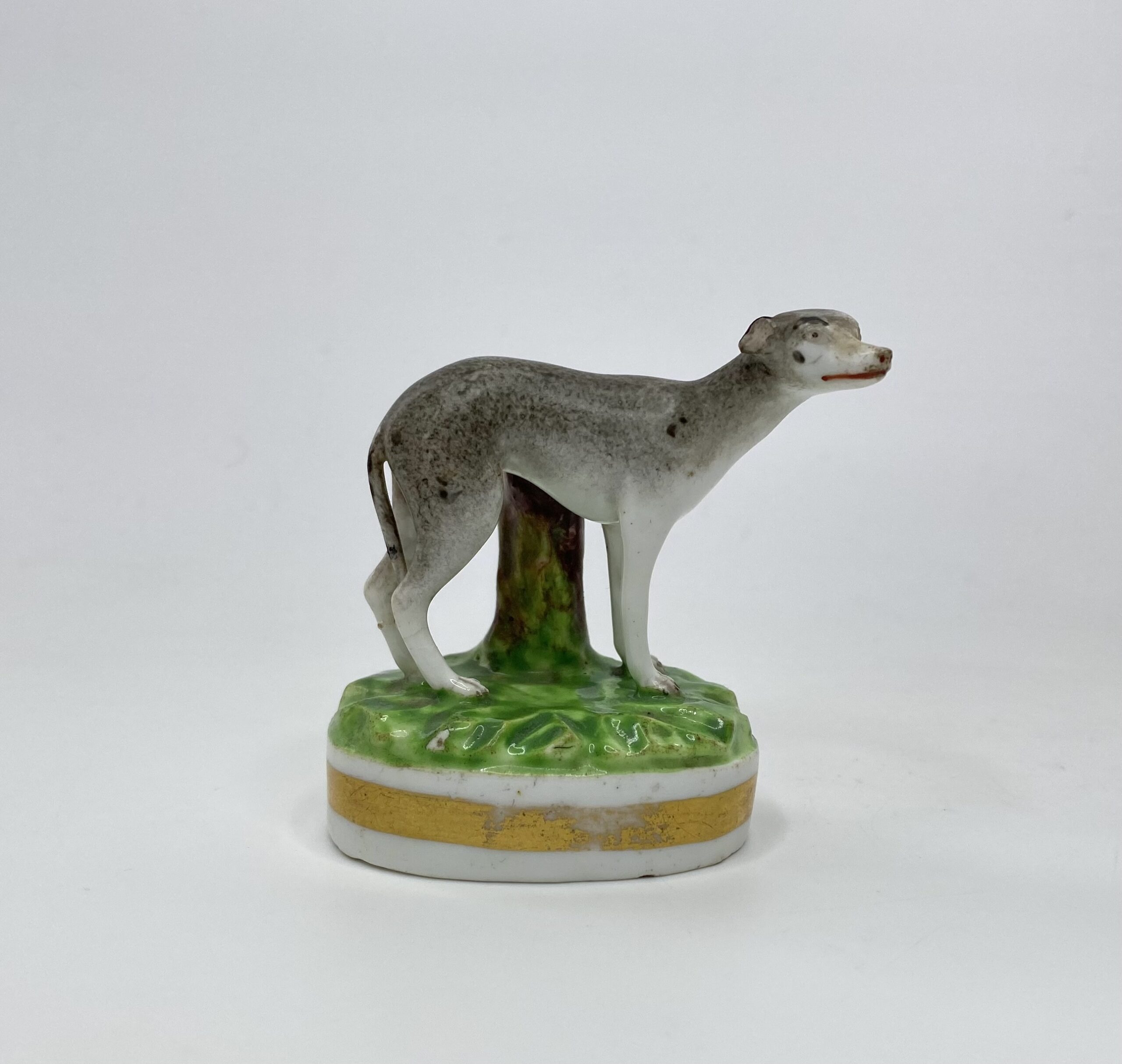 A rare and charming Derby porcelain Greyhound, c.1830. The beautifully observed Greyhound, hand painted in grey, with black markings, standing before a tree stump, upon a grassy mound base.