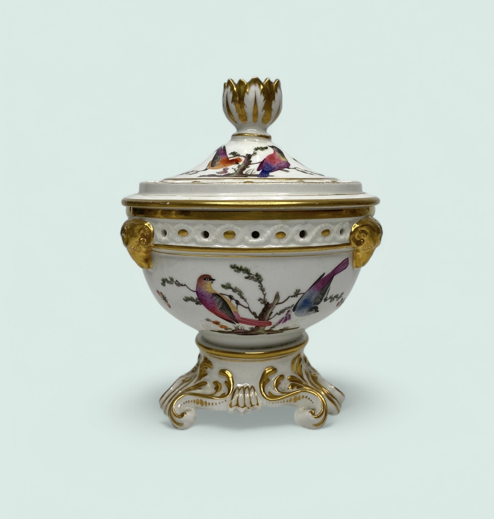 Derby porcelain pot pourri and cover, c. 1815. The pierced, pot pourri, set upon elaborate gilt scroll feet, and moulded with three gilded rams heads, beneath the rim. Hand painted by Richard Dodson, with studies of exotic birds, perched on branches.