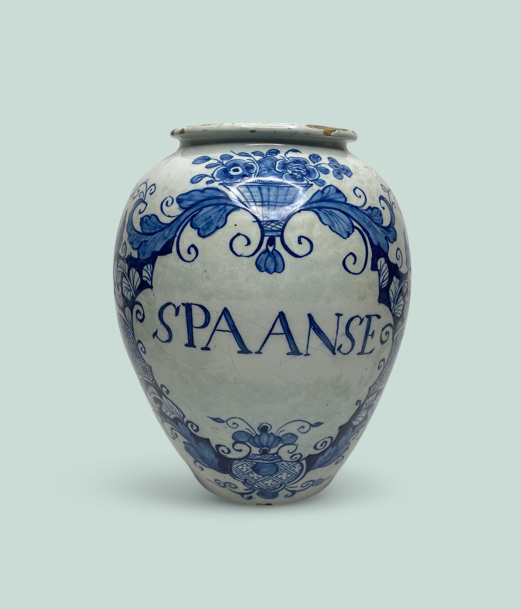 Dutch Delft tobacco jar, c. 1720. Hand painted in underglaze blue with a large cartouche of scrolling leaves, topped with a basket of flowers, and containing the inscription ‘SPAANSE’.