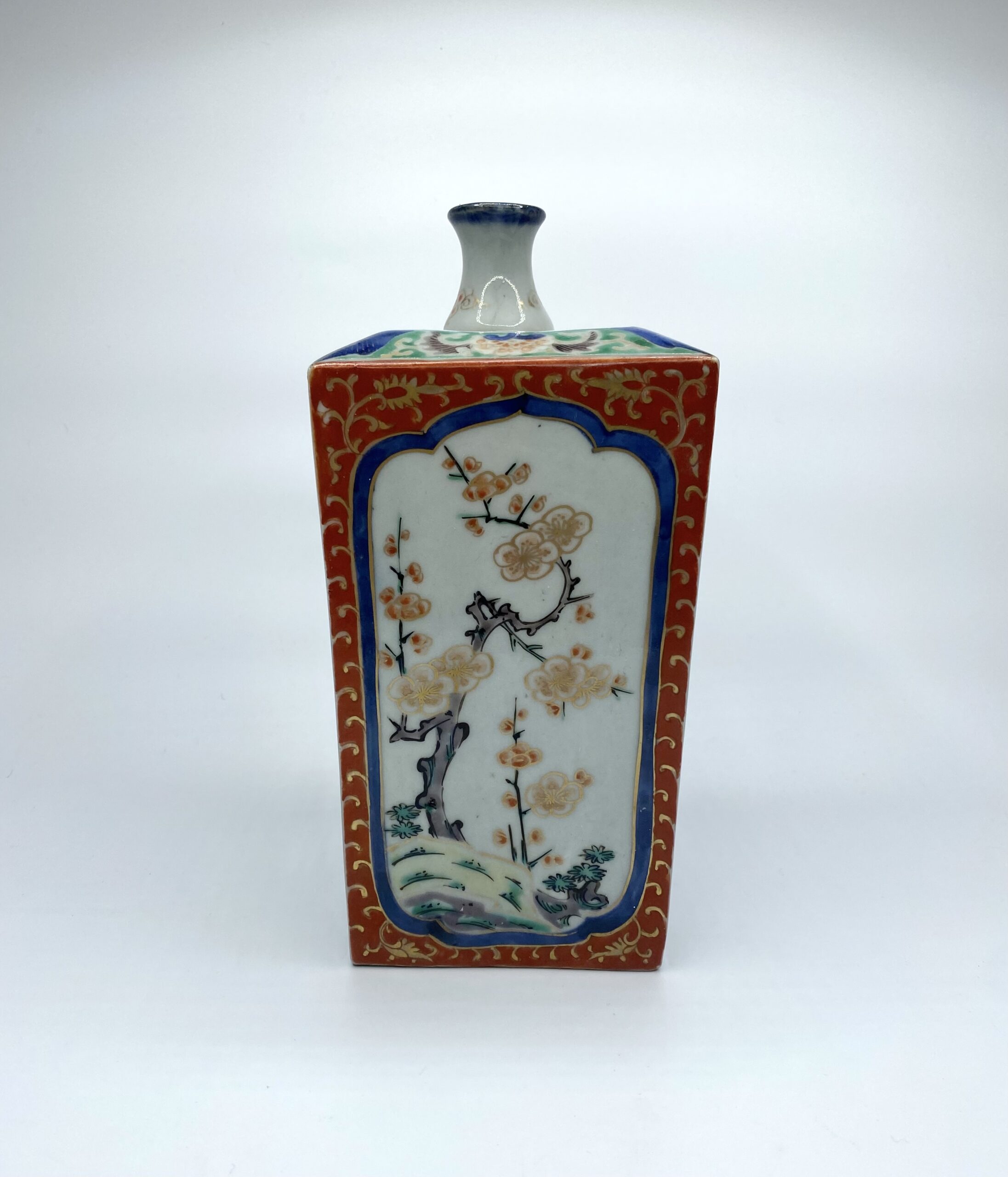 Japanese Imari porcelain tokuri, Arita, c. 1700, Genroku Period. The squared vessel painted with shaped panels of flowering plants, upon textile design inspired grounds. Rising to a similarly decorated raised shoulder, surmounted by a shaped neck.