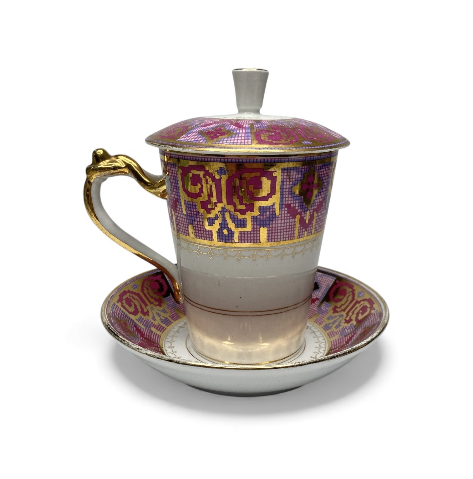 Kusnetzoff ceramic cup, cover and stand, Russia, c. 1890. The cup, painted with a textile design, in puce and gold. Having an elaborate gilt scroll handle.