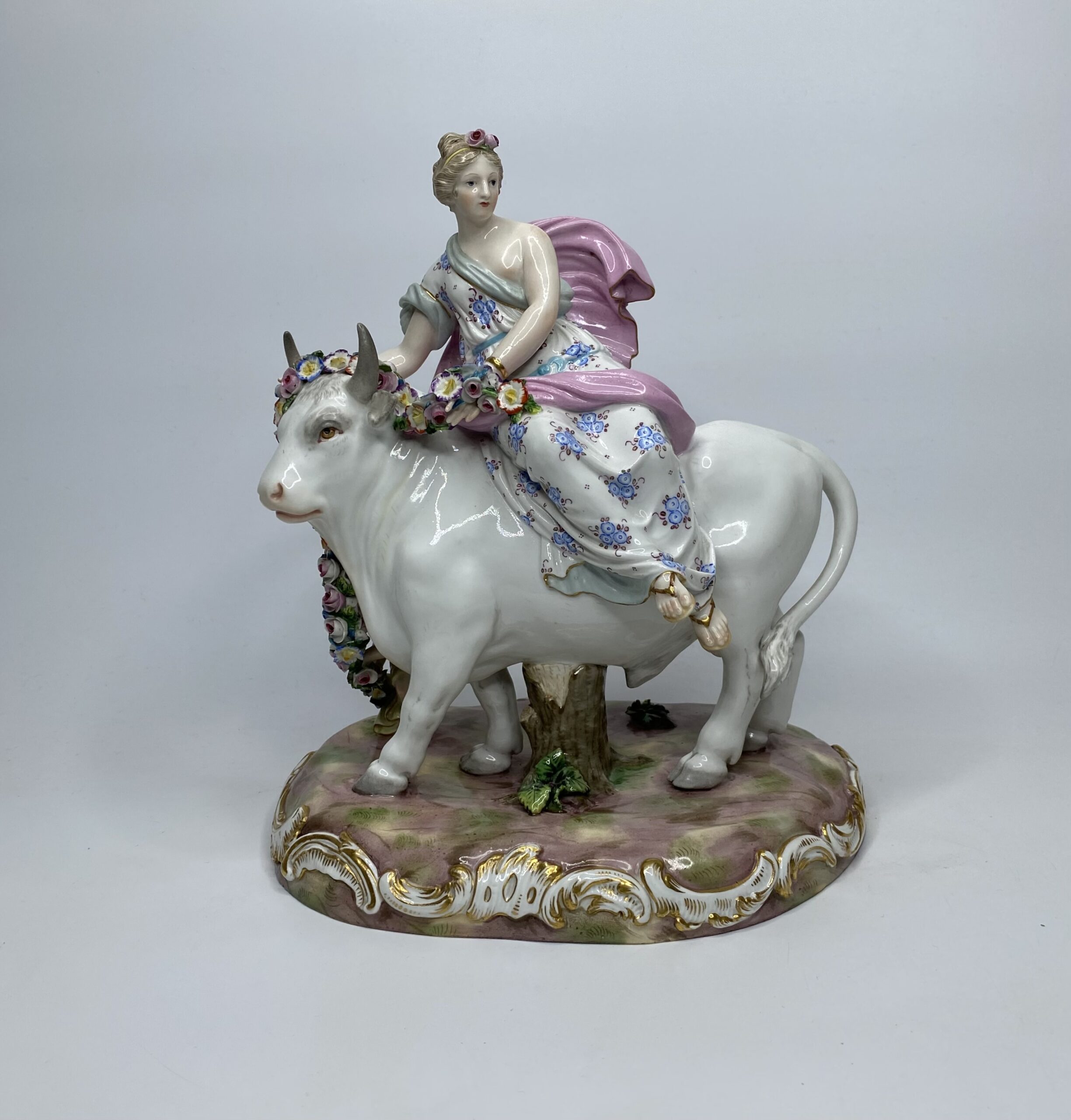 Meissen porcelain figure group, Europa and the Bull, c. 1870. Finely modelled with Europa wearing flowing robes, seated upon a large bull. She holds a garland of flowers, and is attended by a Cupid. Her dress painted with groups of flowers.