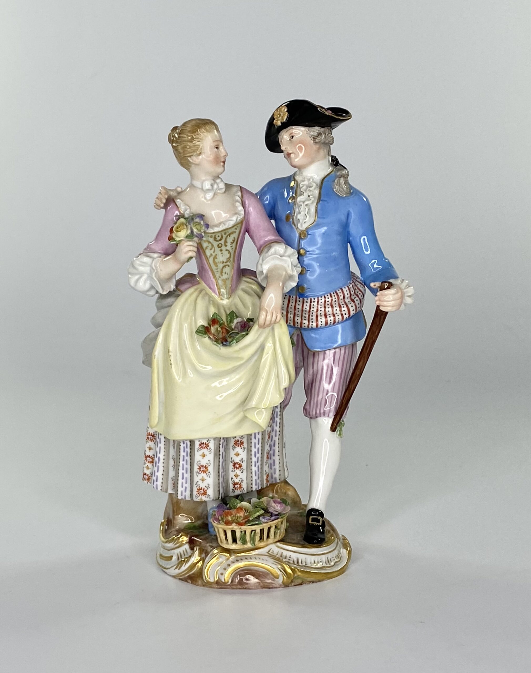Meissen porcelain figure group c. 1870. Finely modelled as a couple wearing 18th Century costume. The lady carries flowers in her apron, before putting them in a basket. The man with his right arm around the ladies shoulder, whilst he carries a cane in his left hand.