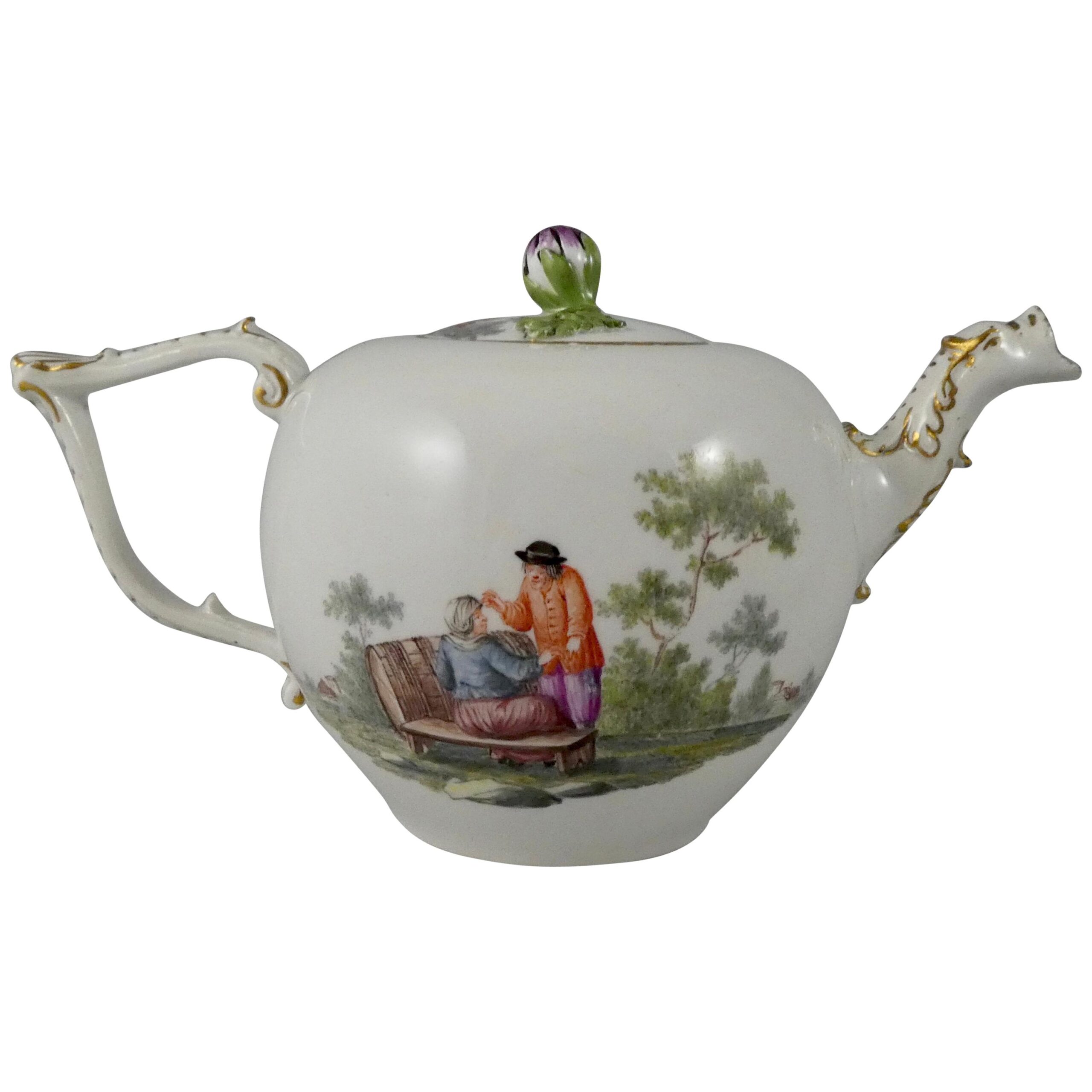 A fine Meissen porcelain teapot and cover, circa 1740. Well painted with scenes of peasants going about their daily life, in rural landscapes, after Teniers. Interspersed with floral sprays. The teapot has a spout moulded as a mythical beast, and a scroll handle, with shell moulded thumb piece. Heightened in gilt.