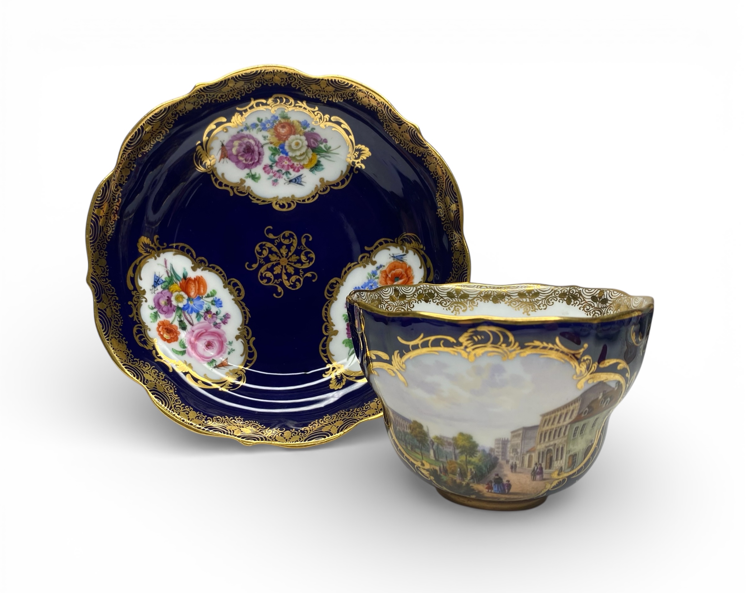 A fine and large Meissen porcelain topographical breakfast cup and saucer, c. 1860. The breakfast cup, beautifully painted with a panel of figures walking in a Dresden street. The remainder of the cup, gilded with elaborate leaf scroll, on a underglaze, cobalt blue ground. Having an elaborate entwined branch scroll handle.