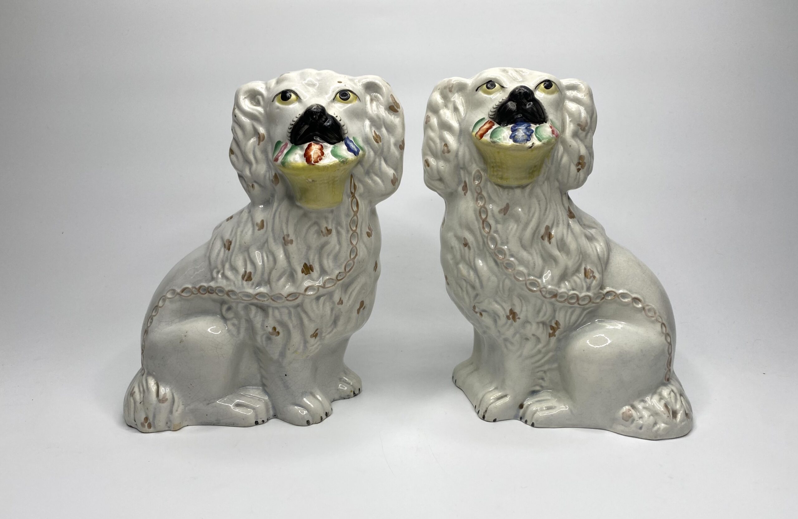A rare pair of Staffordshire pottery Basket of Flowers Little Lion Dogs, c. 1860. Both dogs seated and moulded with gilt spotted manes. They both have moulded gilt chains, and carry a brightly enamelled basket of flowers in their mouths.