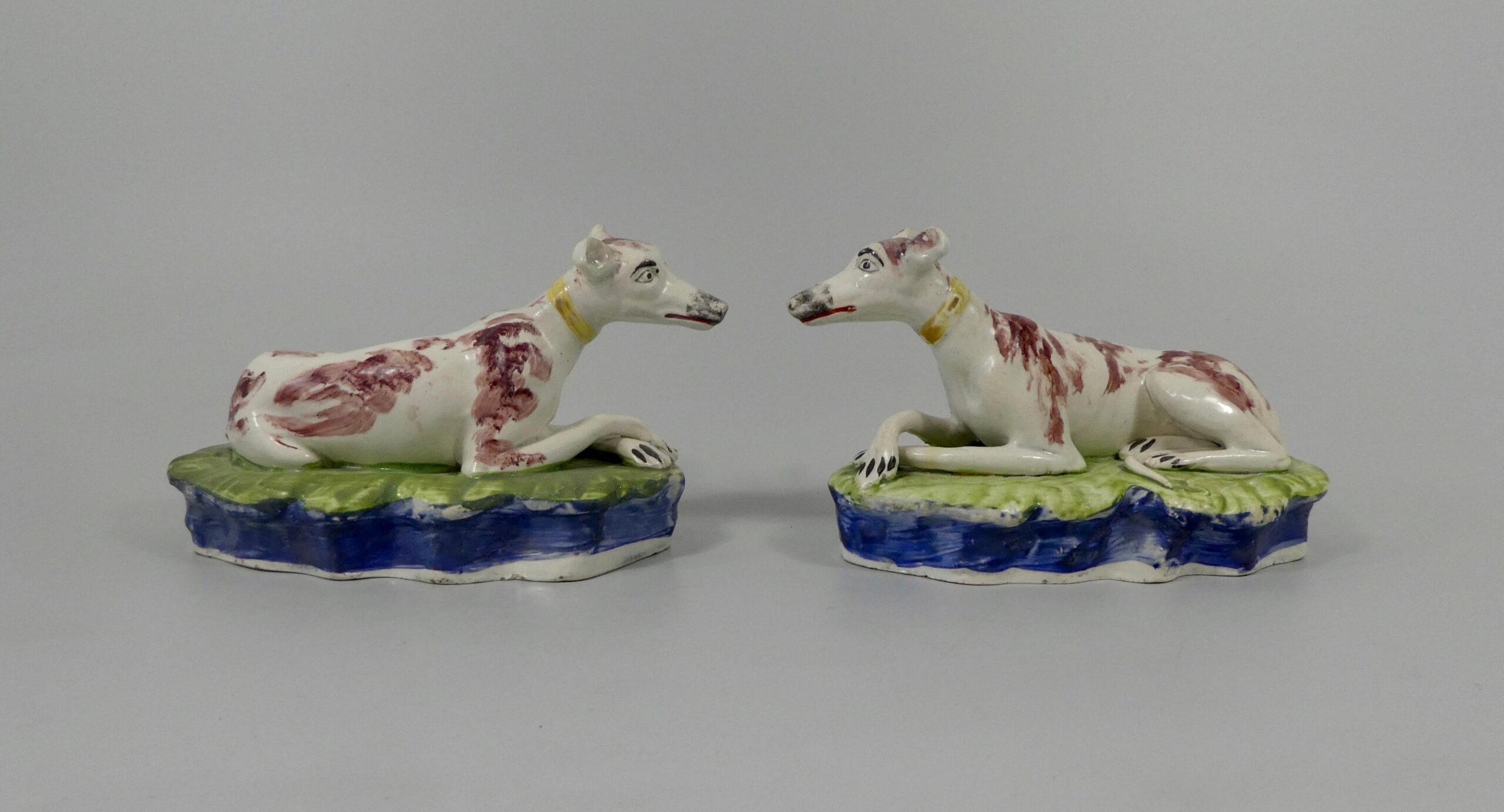 A good pair of Staffordshire pottery figures of hounds. Enoch Wood factory, c. 1830. The recumbent hounds, wit( their front legs crossed, painted with brown markings, and wearing yellow collars. Both hounds laid upon grassy mound shaped bases, edged in overglaze blue enamel. All under a pearlware glaze.