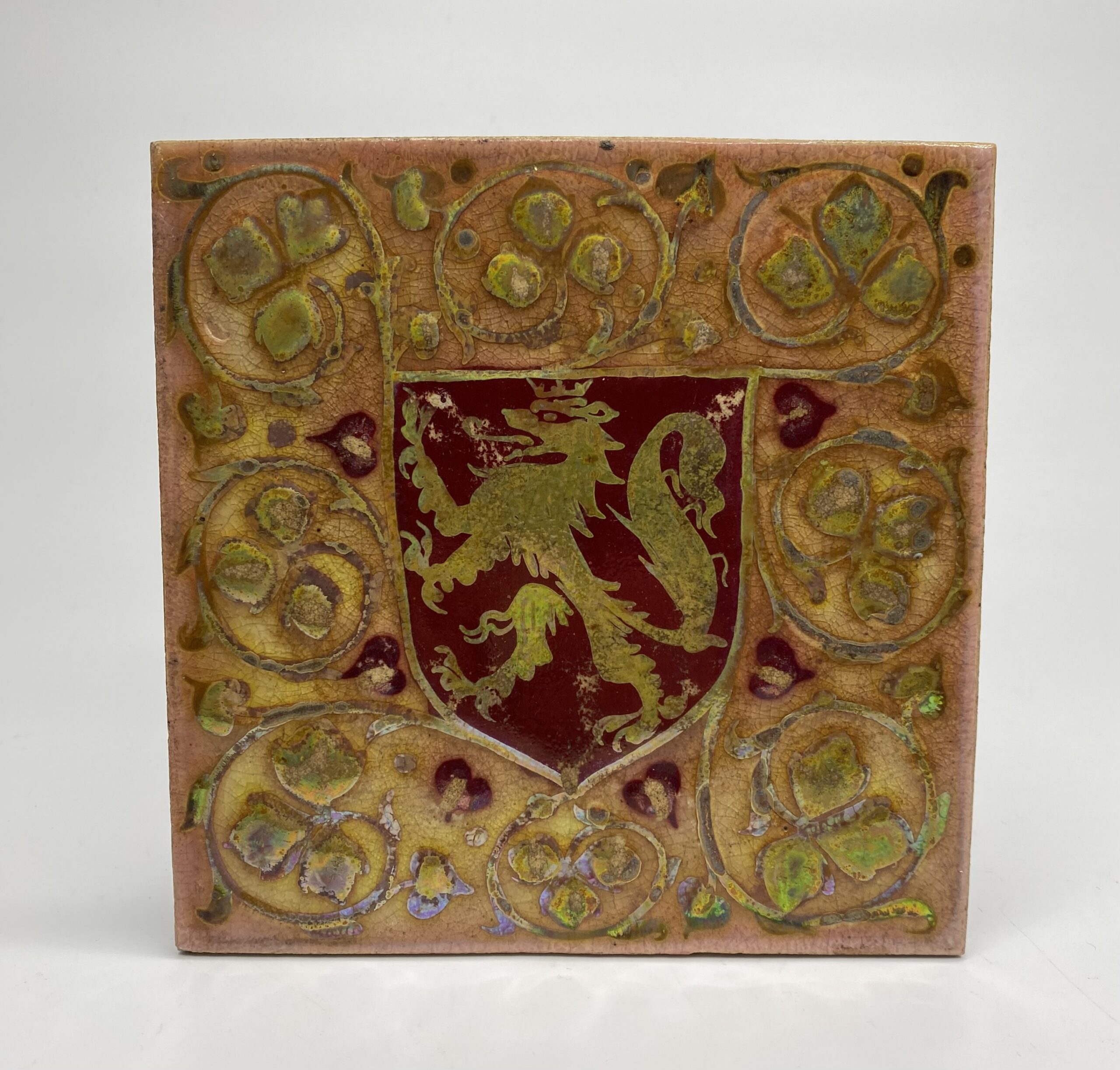 Pilkington Royal Lancastrian Heraldic pottery tile, c. 1910. Decorated to the centre, with a Lion Rampant, in silver lustre, on a red shield.