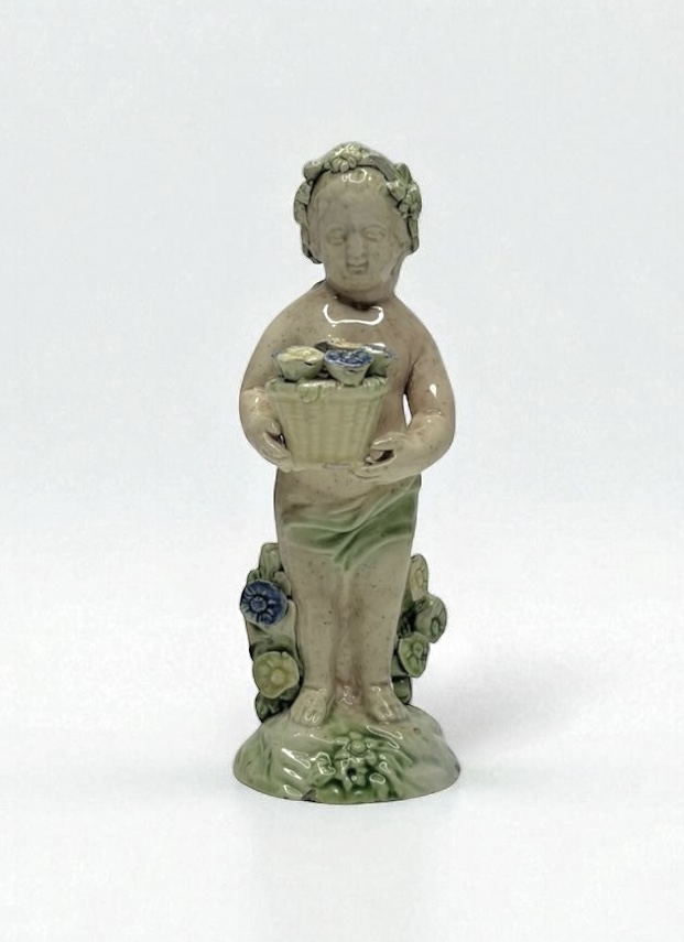 Ralph Wood pottery figure of a Putti, Staffordshire, c. 1780. The finely potted Putti, holding a basket of flowers, and wearing a garland in his hair. Supported by a flowering plant, and set upon a circular grassy mound base.