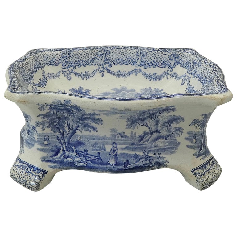 A rare Ridgway pottery dog bowl, circa 1840. The shaped dog bowl, set upon four moulded feet, and printed in underglaze blue, with figures in a rural landscape. within a swag and scroll border. The exterior printed with the same scene.