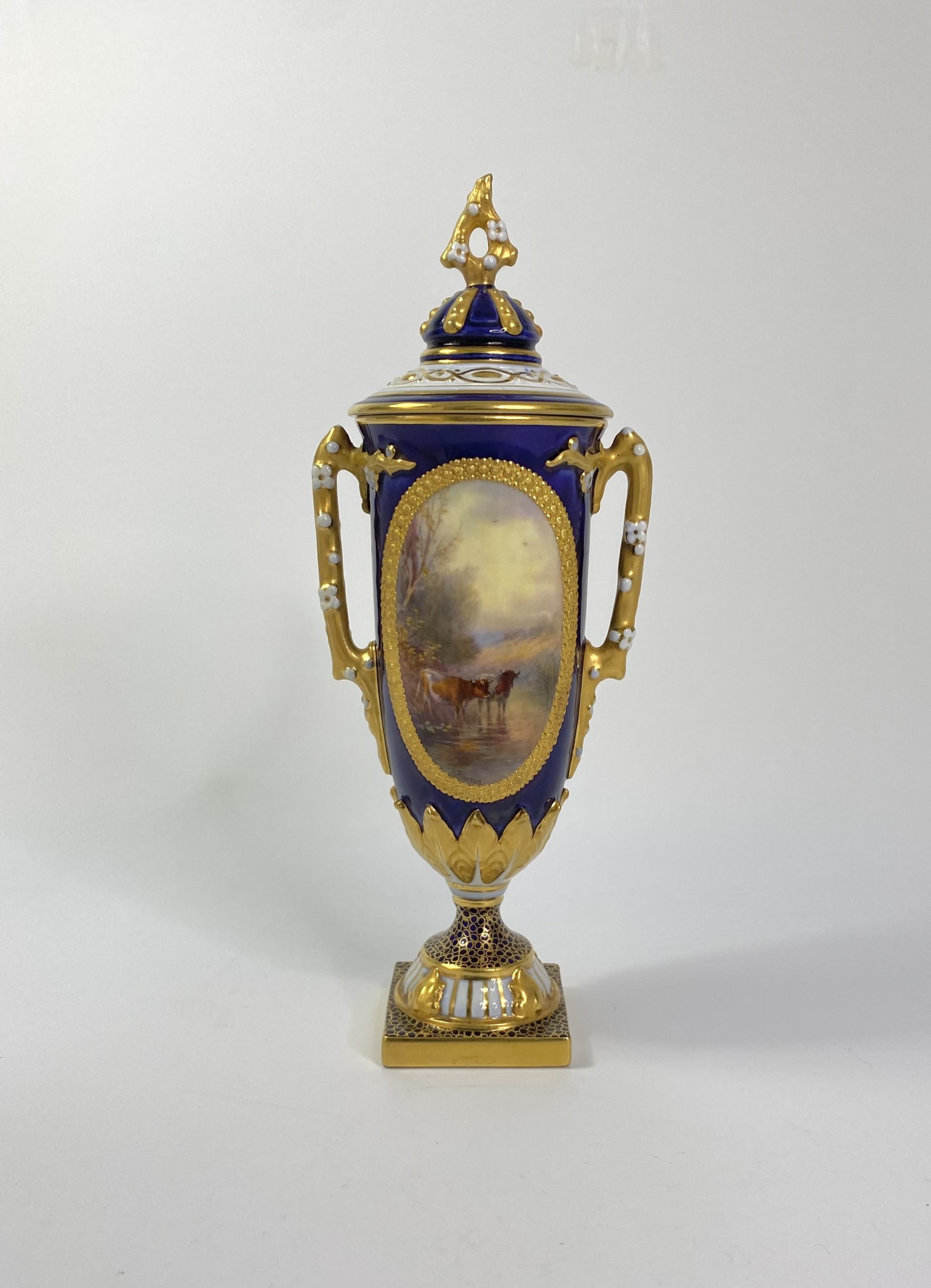 Royal Worcester porcelain vase and cover, painted by Harry Stinton, dated 1912. Hand painted to the centre, with an oval gilt beaded panel of Lowland cattle in a river landscape, on a cobalt blue ground.