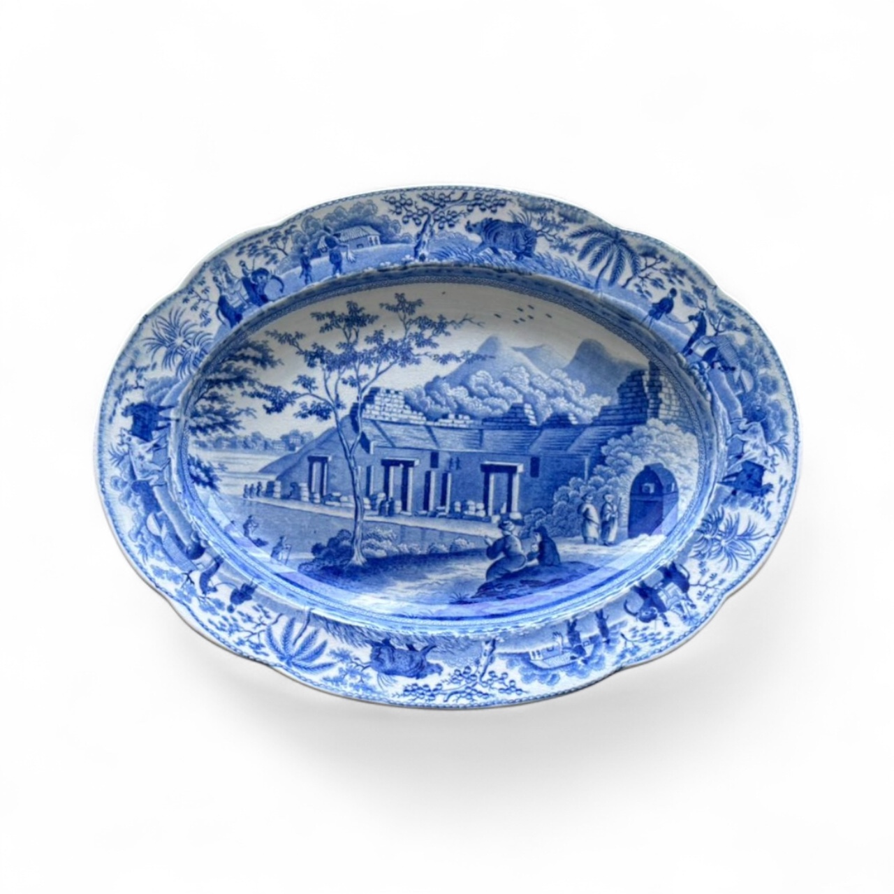 Spode Caramanian series platter, ‘Part of the Harbour of Macri’, c. 1815. Printed in blue and white, with an oval scene of figures around the ruined harbour, now known as Fethiye in Turkey.