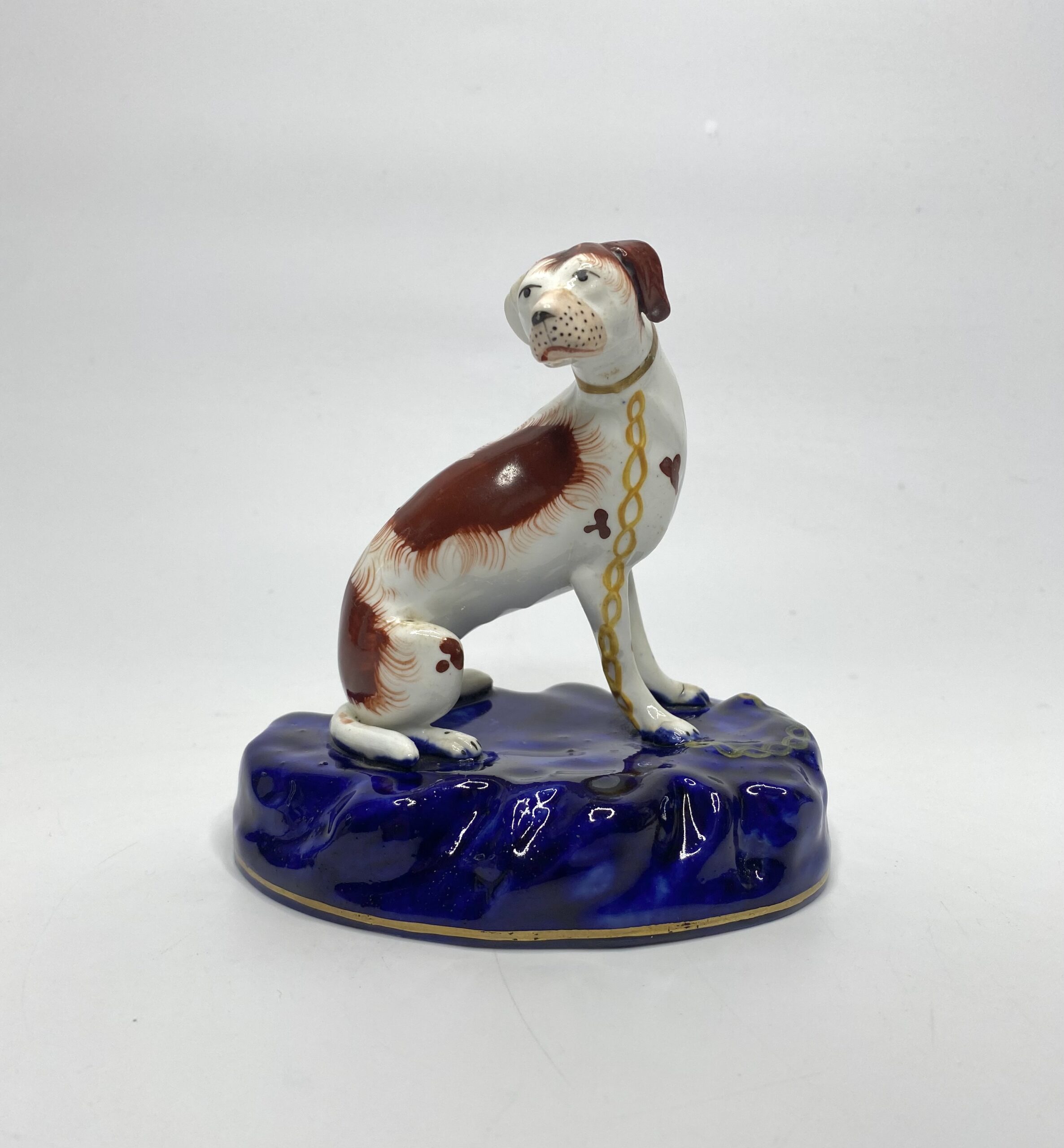 Staffordshire pottery figure of a Hound, c. 1840. Finely modelled as a seated hound, wearing a gilt collar and yellow chain. Painted with liver coloured spots.
