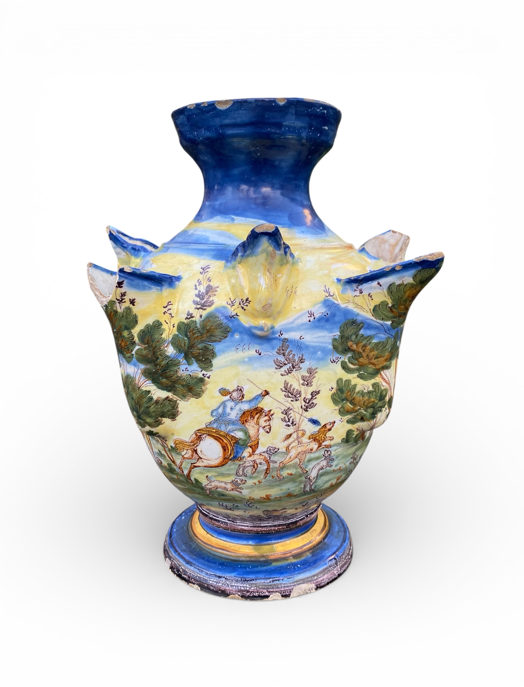 A rare Talavera de la Reina ‘grand feu’ tulipiere, c. 1660. The body, precisely painted with huntsman riding horses, and their attendants, vigoursly pursuing lions and stags, with hounds, in woodland.Typically painted in ochre, blue, and yellow tones.