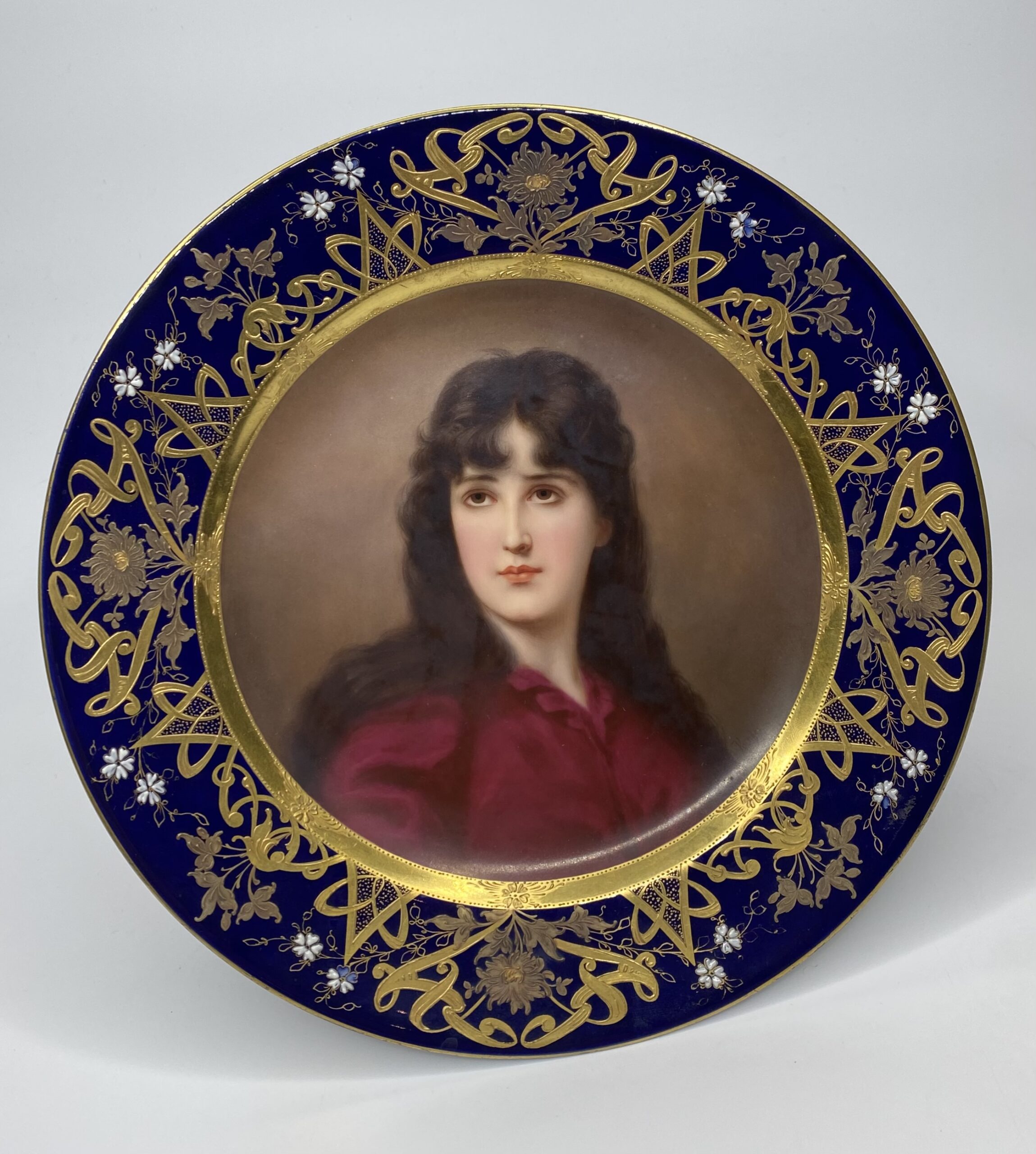 Vienna porcelain dish, Betterlin, signed Klinger, c. 1900. Finely hand painted to the centre, with a titled portrait of a young girl with brunette hair, ‘Betterlin’. The cobalt blue border, gilded and enamelled with a continuous band of floral scroll, in Art Nouveau style.