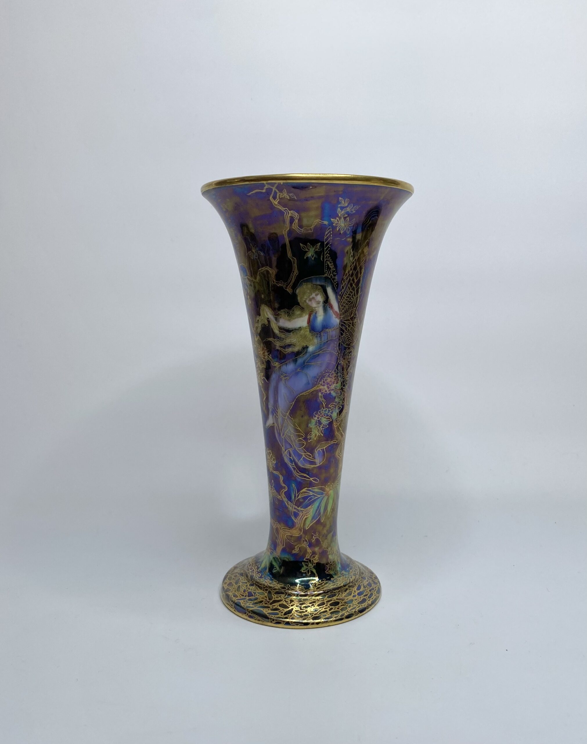 Wedgwood Fairyland Lustre vase, c. 1925. The Daisy Makeig-Jones designed conical shaped vase, decorated with the ‘Butterfly Women’ pattern, of fairies sat amongst flowering trees, on a black lustrous ground. Firebolgs amongst trees adorn the interior of the vase, beneath a gilt rim.